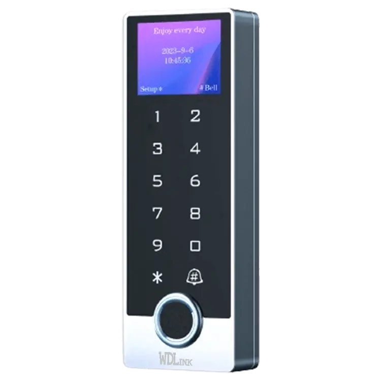 Metal case ,capacitor touch keypad with LCD Screen. 10000 card users & 200 fingerprints. WG26 input/output. Remote unlock by Mobile App . Manage users by mobile phone APP. Set temporary code & public code. Check visitor records. Adjustable volume & mutiple language choices. Access ways: fingerprint, card, code, mobile App.